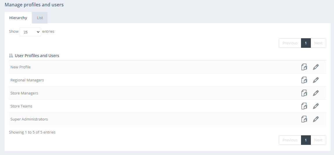 To copy a user profile, click the icon. This will add a copy of the profile to the list which can then be edited as required.