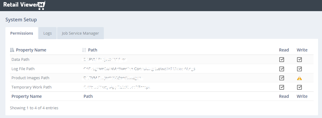 The Permissions tab details various file paths as defined in the Configuration Utility and confirms whether Read and Write access is granted to these file paths.